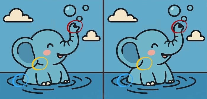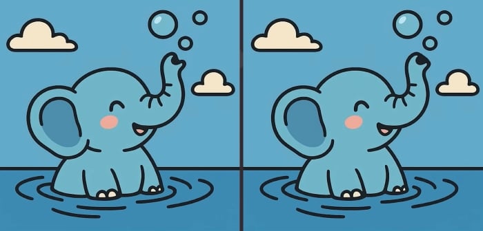 Tässä on kaksi kuvaa elefantista leikkimässä vedessä. Ensi silmäyksellä ne ovat täysin identtisiä, mutta tämä on vain illuusio. Kuviin on piilotettu kolme pientä eroa.