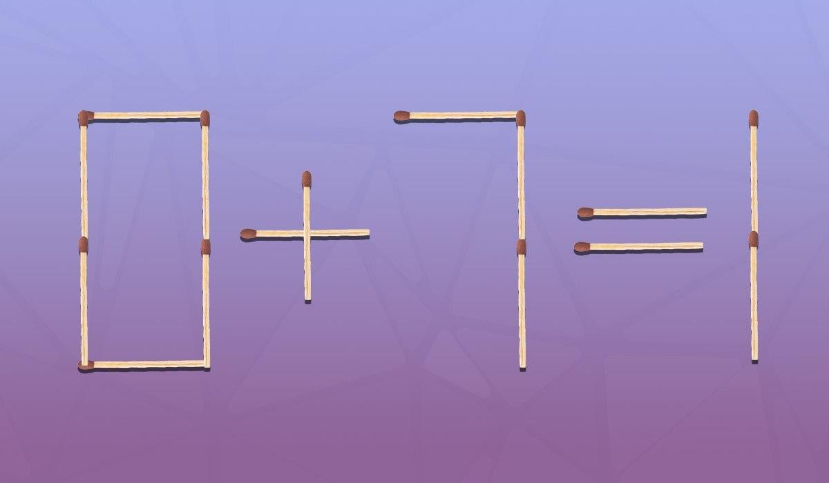 Joten alla näet kuvan, jossa yhtälö 0+7=1 on asetettu otteluiden avulla. Tässä on selvästikin virhe. Sinun tehtäväsi on korjata tasa-arvo tekemällä pieni muutos.
