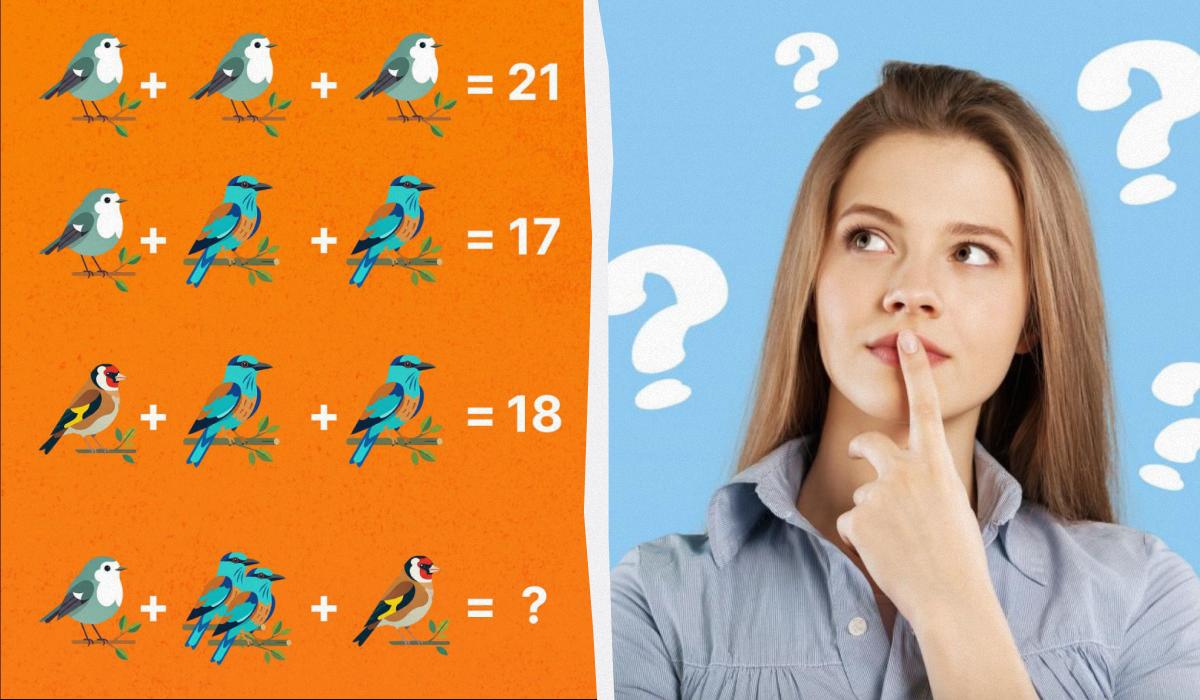 Sinun on selvitettävä, mikä on kokonaismäärä, jos lasket yhteen kolme numeroa, joita kukin lintu symboloi. Oletko valmis? Aika on kulunut.