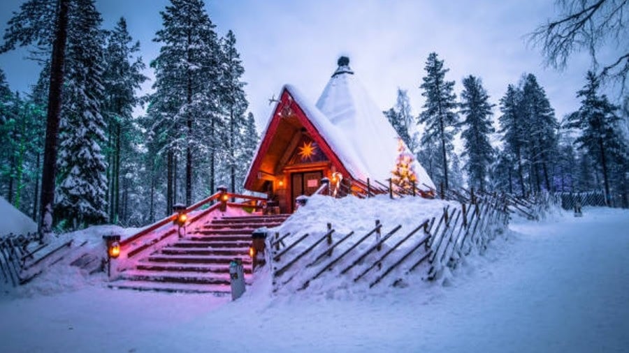 Kuvassa on talo, johon sinun on kiivettävä suuria portaita ylös päästäksesi. Talon ympärillä on havumetsää, puiden oksat taipuvat suuresta lumesta. Talon lähellä on lyhdyt ja koko piha on paksun lumikerroksen peitossa, joka peittää lähes kokonaan aidan.