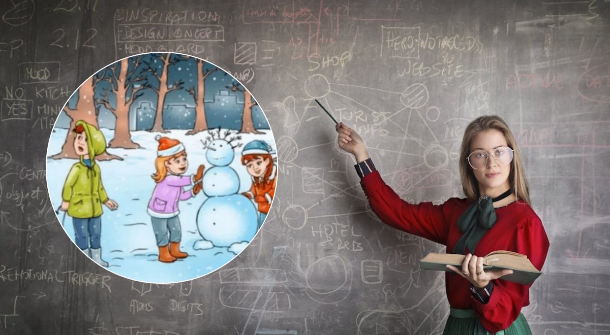 Kuvassa kolme lasta lumisessa metsässä: kaksi tekee lumiukkoa ja yksi kädessään kelkaa. Niiden ympärillä on useita puita. Jossain tässä kohtauksessa oli piilossa peura.