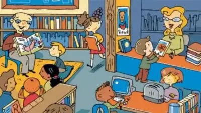 Kuvassa kirjasto, jossa on paljon lapsia. Jotkut heistä etsivät kirjoja, joita he halsivat lukea, toiset istuvat tietokoneiden ääressä tai kommunikoivat keskenään.