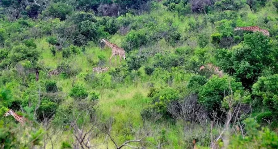 Näemme ryhmän eläimiä vaeltavan vihreiden puiden ja pensaiden keskellä. Kuvassa on tietty määrä kirahveja ja seeproja. Mutta niiden tarkan määrän laskeminen ei ole helppoa. Loppujen lopuksi jotkut eläimet ovat selvästi näkyvissä, mutta samaan aikaan jotkut niistä voivat olla piilossa silmiltämme.