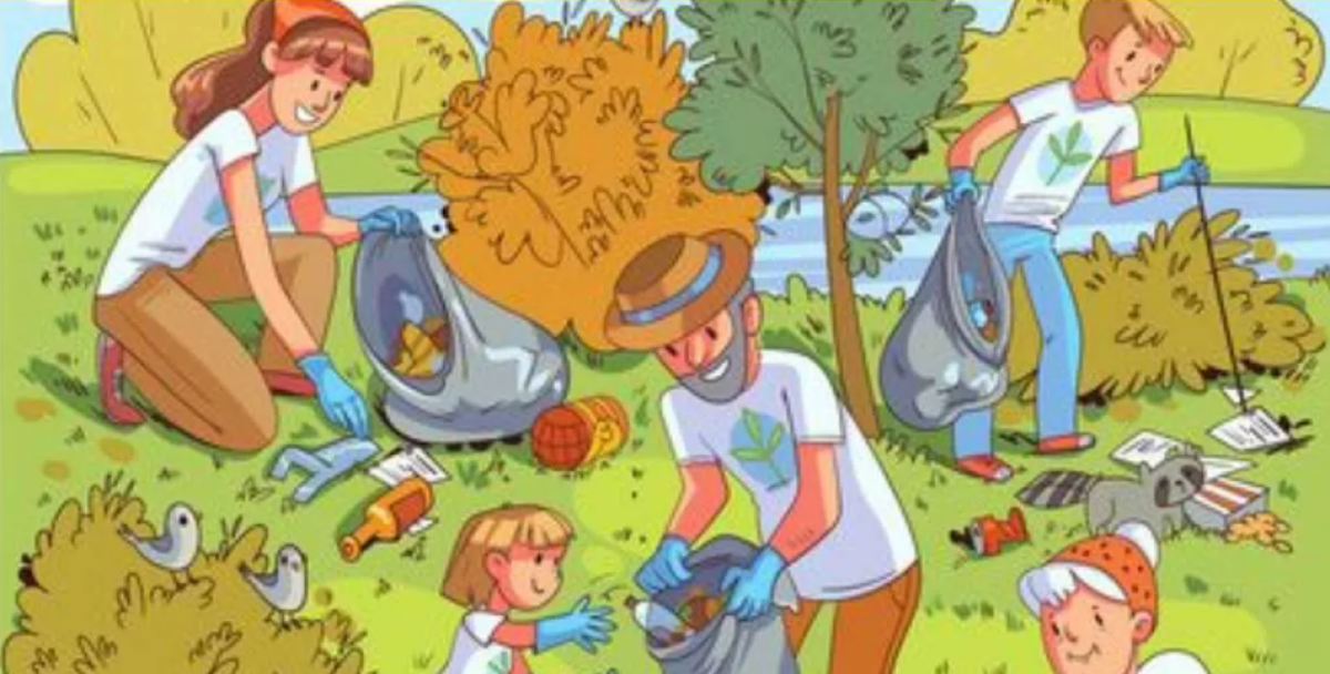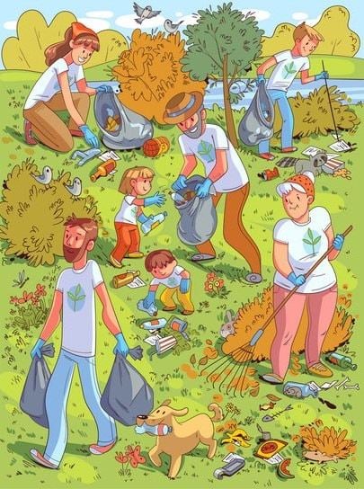 Kuvassa lapsiperheet, he tulivat puistoon siivoamaan roskat. Jopa linnut ja pesukarhu katsovat mitä tapahtuu. Mutta sinun täytyy löytää kilpikonna.
