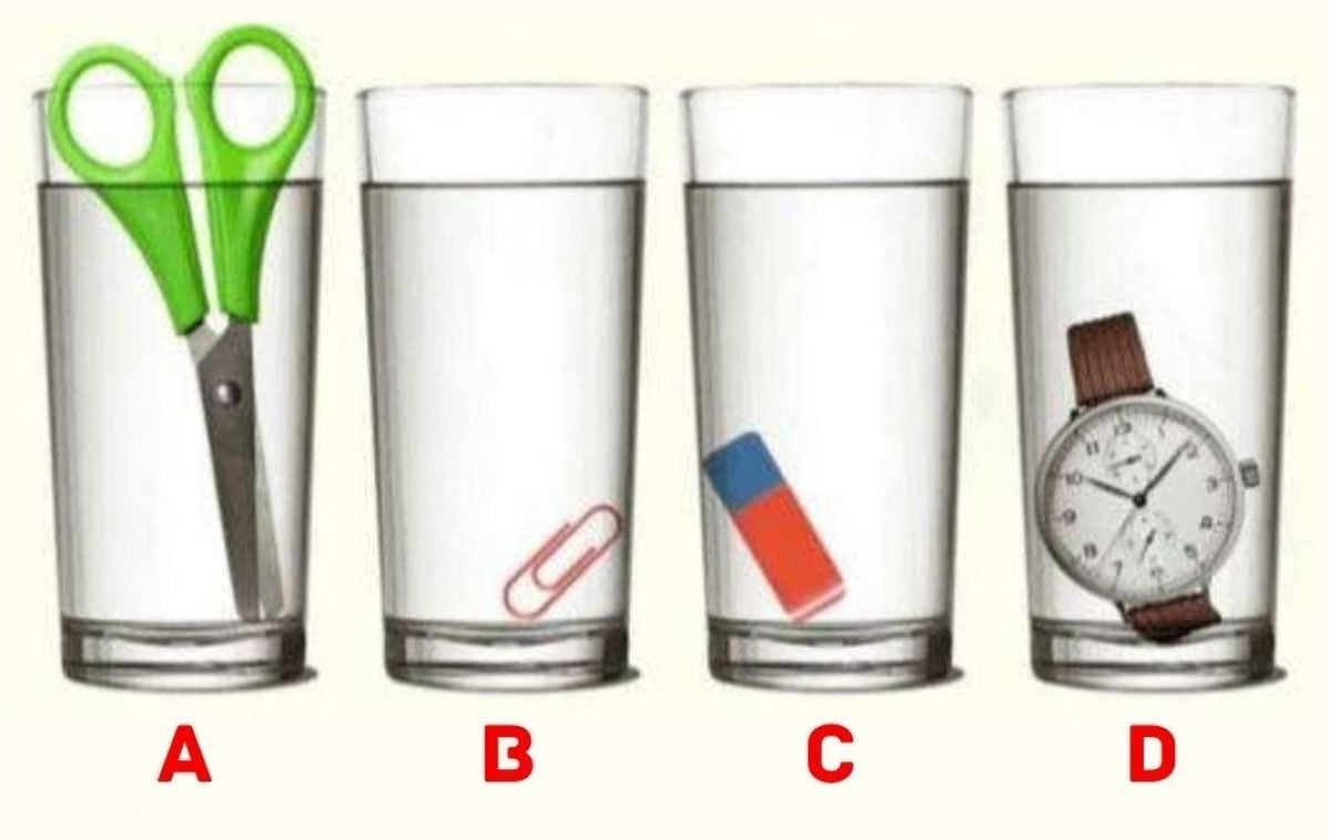Kuvassa neljä lasillista vettä, joista jokaisessa on erillinen esine: sakset, paperiliitin, pyyhekumi ja kello. Sinun on määritettävä, mikä lasi sisältää enemmän vettä.
