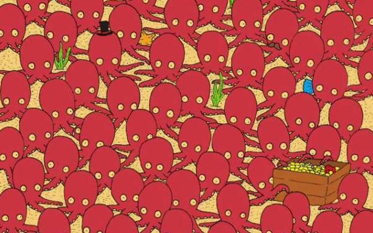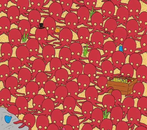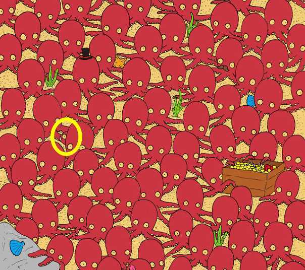 Yritä ratkaista vaikea, mutta hauska optinen illuusio – kala on piilotettu melko hyvin mustekalan joukkoon, ja sinun on silti yritettävä löytää se.