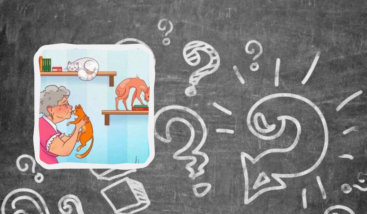 Kuvassa naiseläkeläinen lemmikkien ympäröimänä. Kissat ja eri rotuiset kissat leikkivät ja rentoutuvat huoneessa. Saattaa tunt että kuvassa ei ole mitään tarpeetonta, mutta näin ei ole – taiteilija piilotti epäjohdonmukaisuuden tähän.