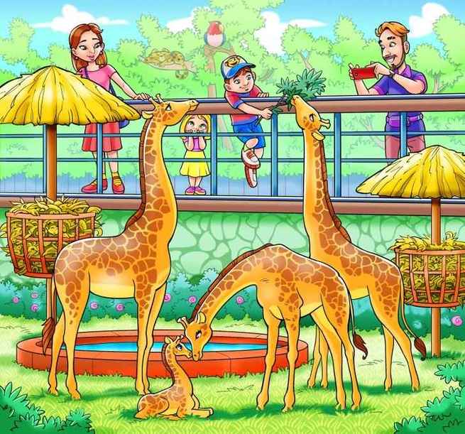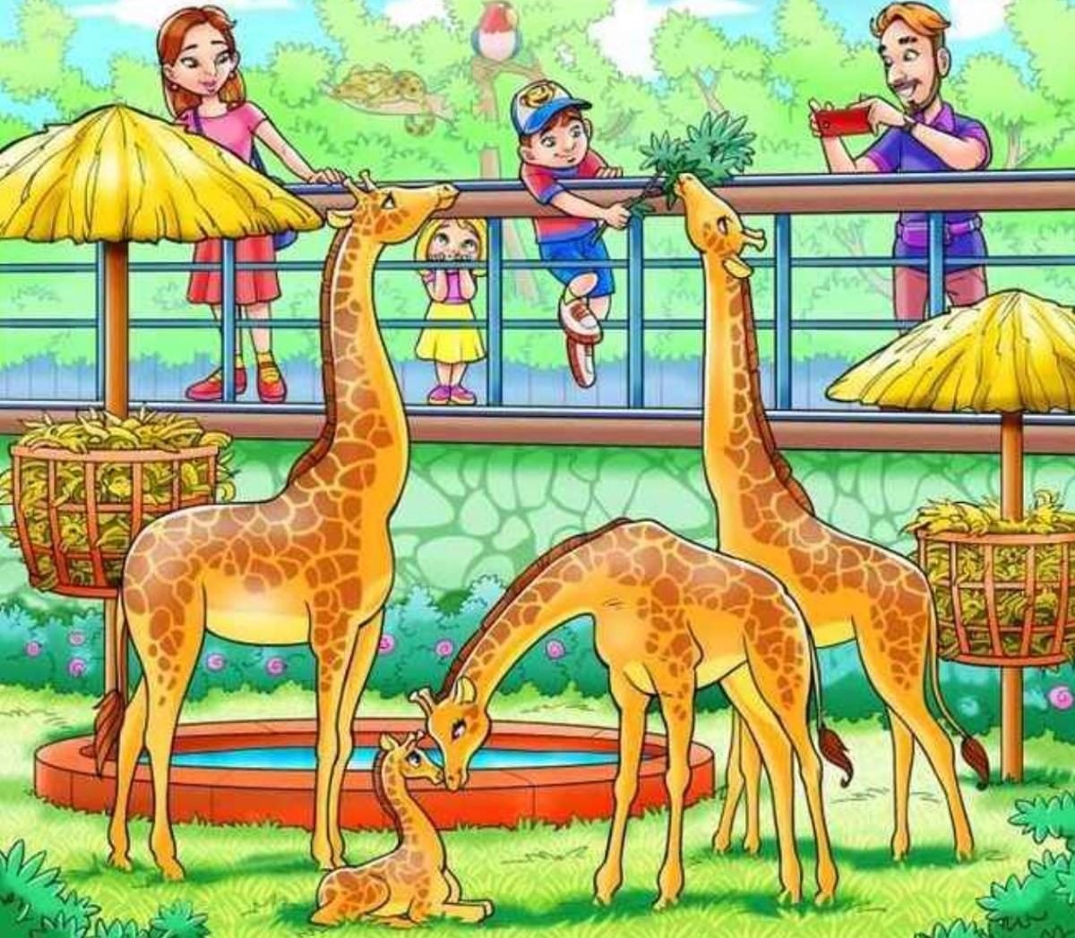 Kuvassa perhe eläintarhassa. Mies kuvaa kirahveja puhelimellaan ja hänen lapsensa ja vaimonsa katselevat eläimiä. Täällä jossain piileskelee apina, joka sinun täytyy löytää.