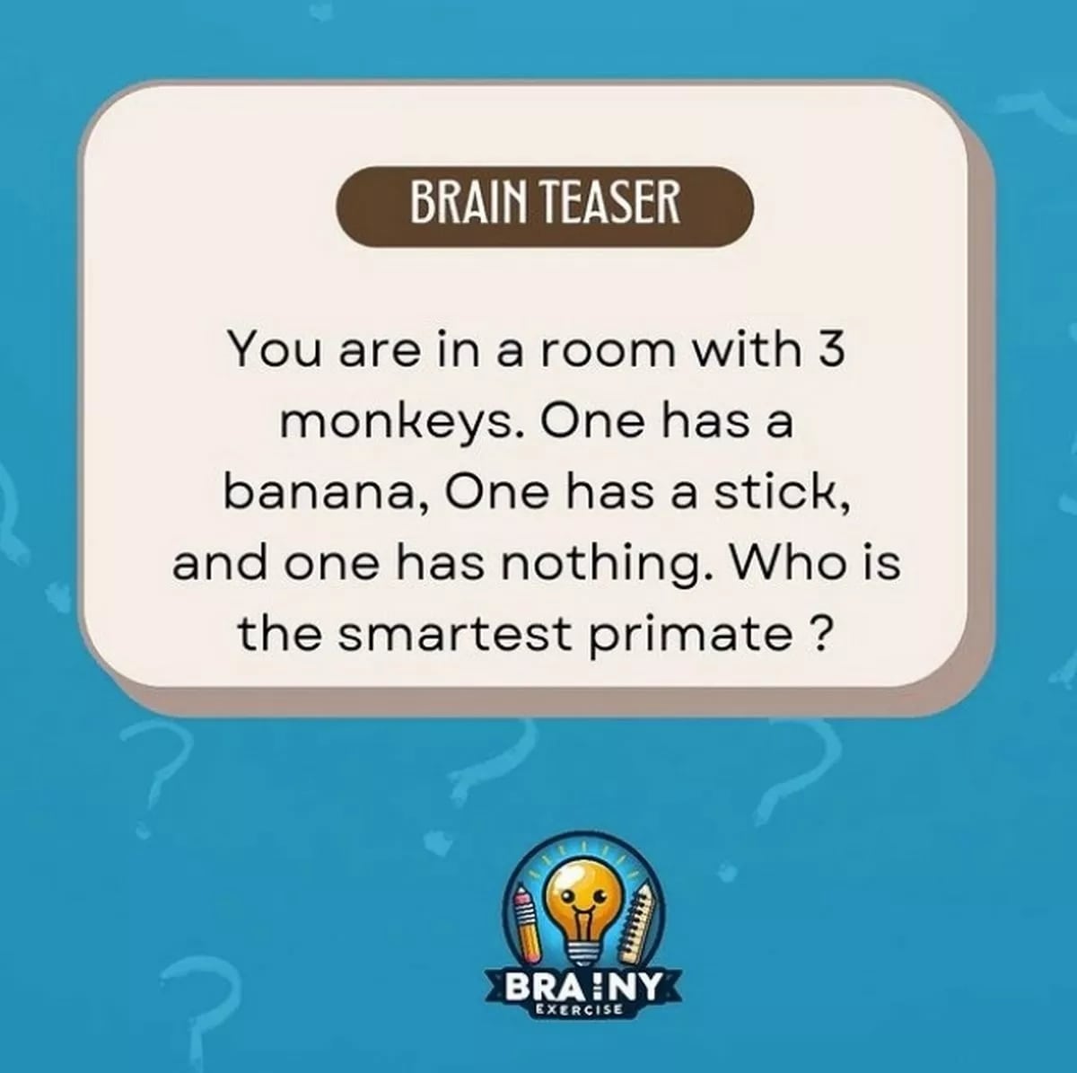 Mirror julkaisi yhden niistä, ja sinulla on vain 30 sekuntia sen ratkaisemiseen, ja arvoitus kuuluu näin: ”Huoneessa on kolme apinaa. Ensimmäisellä on banaani kädessään, toisella on keppi ja kolmannella ei ole mitään. Kuka on älykkäin kädellinen?”