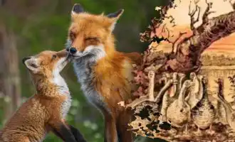 Koira näkyy puun juuressa vasemmalla puolella, jossa osa hänen päästään näkyy.