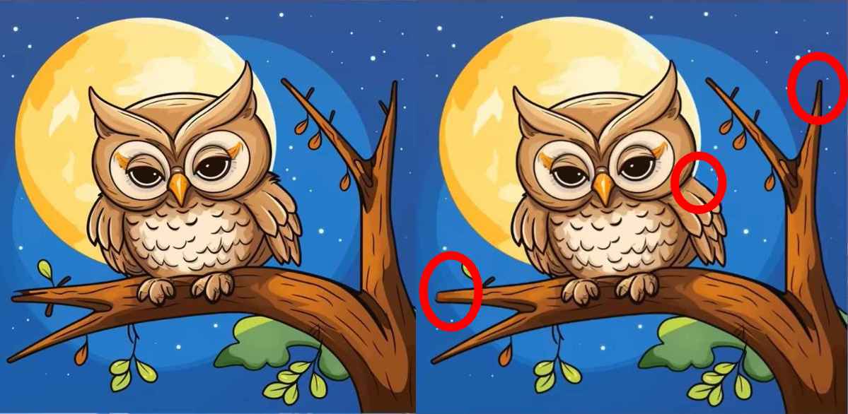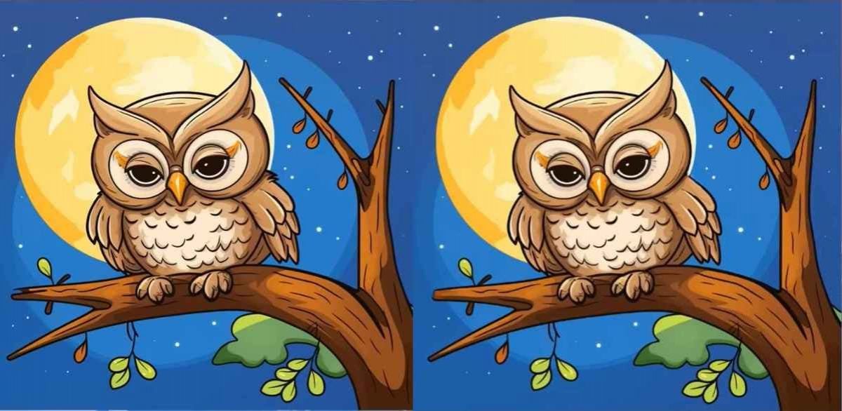 Tässä on kaksi kuvaa pöllöstä puussa. Ensi silmäyksellä ne näyttävät täysin identtisiltä, mutta näin ei ole – niiden välillä on piilotettu kolme hienovaraista eroa.
