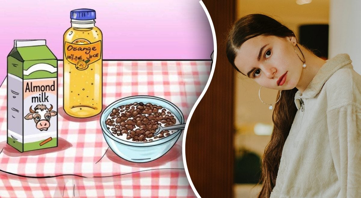 Kuvassa näkyy kulho maidolla kasteltmuroa, houkuttelevia suklaakeksejä, pullo virkistävää appelsiinimehja laatikko terveellistä mantelimaitoa. Ensi silmäyksellä piirustuksessa ei ole virhettä. Mutta tämä on juuri tilanne, kun sinun ei pitäisi luottaa ensivaikutelmaan.